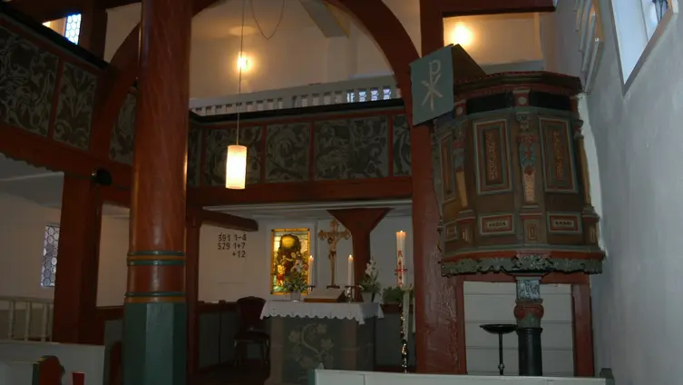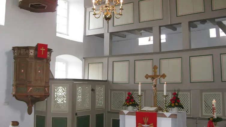 Beeindruckend für das kleine Kirchlein ist die mit dezenten Schnitzereien und zurückhaltender Bemalung verzierte Kanzel mit Schalldeckel (aus der Erbauungszeit der Kirche).