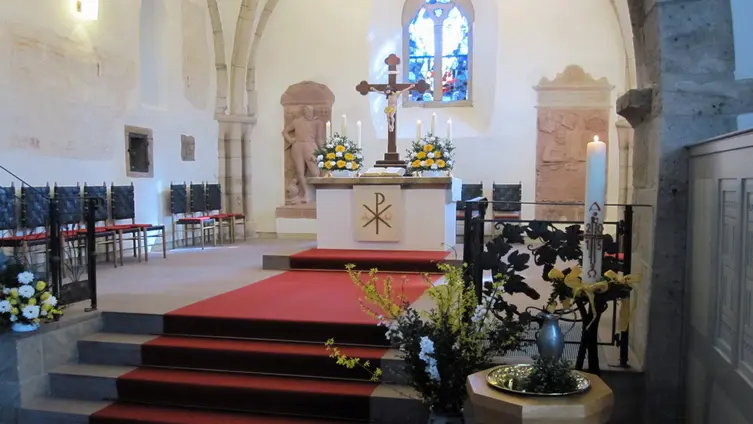 Auf dem steinernen Altar (mit ausgeräumten Reliquiennischen) von 1696 steht heute das alte barocke Kruzifix - eingelassen in ein Kleeblattstandkreuz.