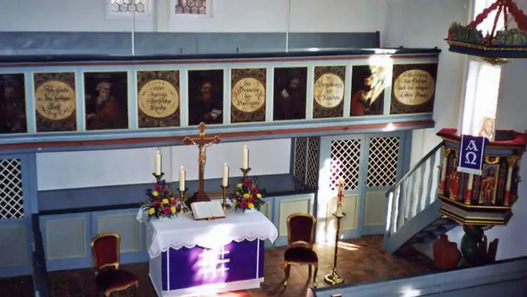 Die Holzbrüstung der Empore ist abwechselnd mit Schriftzügen aus dem Apostolischen Glaubensbekenntnis und den alten Ölgemälden geschmückt.