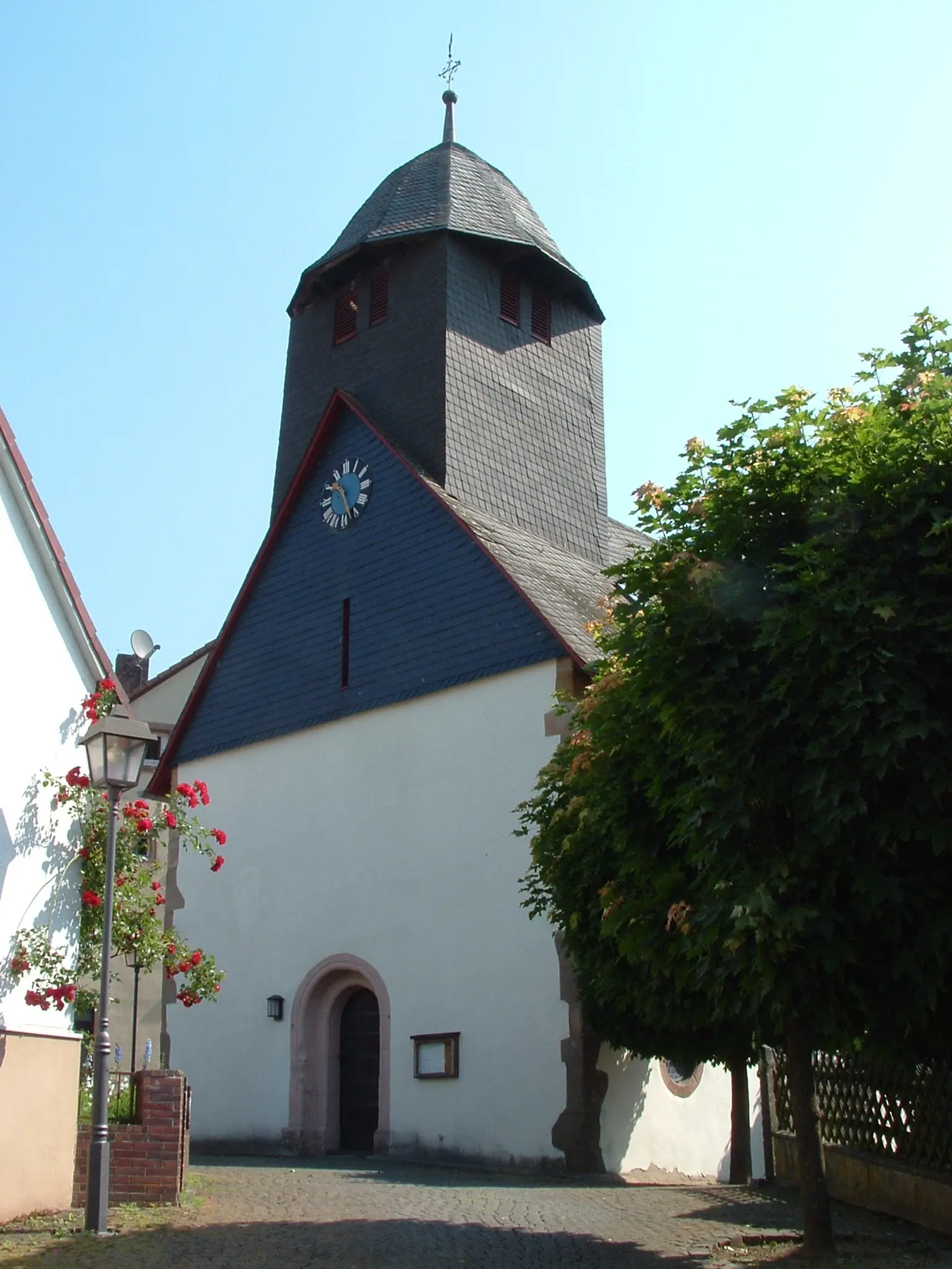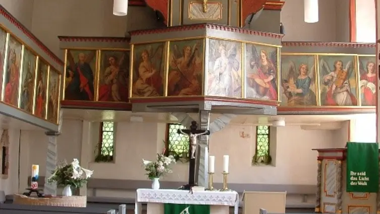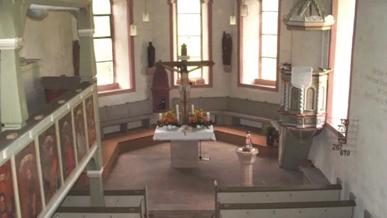 „Die Kirche hat eine verputzte Holztonne Bei den Instandsetzungsarbeiten, die unter Leitung des hessischen Hochbauamtes im Jahr 1927 stattfanden, wurde auf Anregung älterer Einwohner nach alten Malereien gesucht - mit bestem Erfolg. Nach Abschlagen des Putzes ergaben sich auf der durch Leisten geteilten Holzschalung Malereien aus der Zeit um 1700. Wie nicht anders zu erwarten, waren auch die Emporenbrüstungen unter dem jetzigen Anstrich mit Malereien bedeckt, mit Apostelfiguren, die nun ans Tageslicht gezogen wurden. So ist ein köstlicher Innenraum entstanden, bildreich, wie kaum ein anderer. Maler D. Kienle, Eberstadt, führte die Arbeiten in glücklicher Weise durch“.